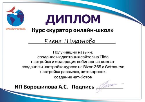 Помощник в организации онлайн-проектов. В 2020 году прошла курс "Куратор онлайн-школ" в Школе Фриланса и сразу приступила к работе в этом направлении.